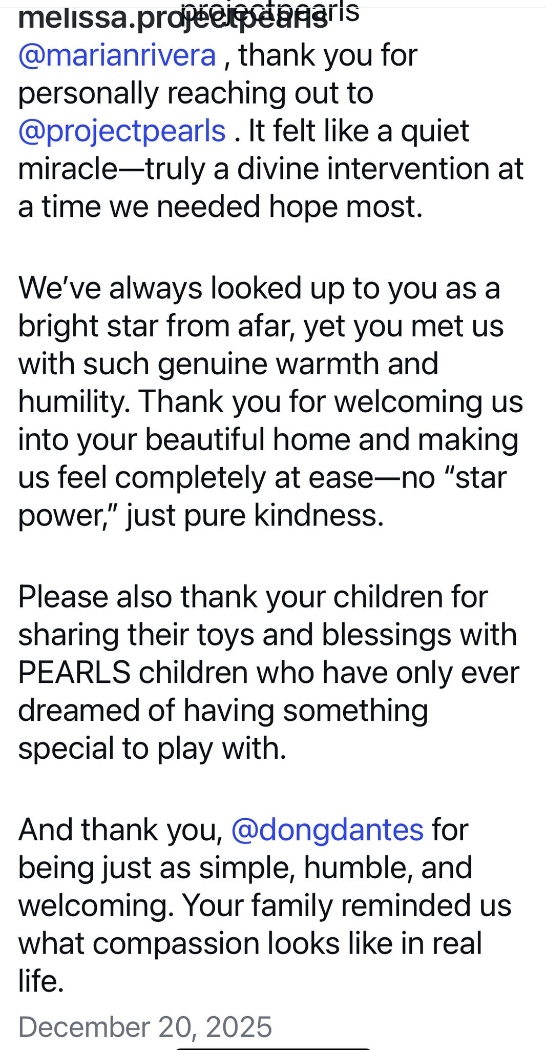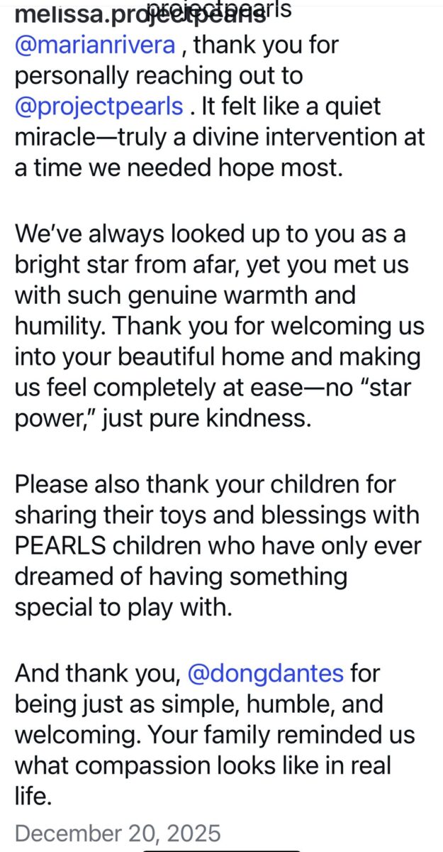 Project Pearls thanked Marian, Dingdong and their children for welcoming the org into their home and for sharing toys and blessings to the Pearls’ children. ❤️❤️