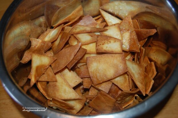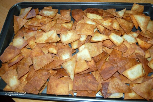 5. Preheat the oven to 350°. Lay the fried flour tortilla chips into a sheet pan.
