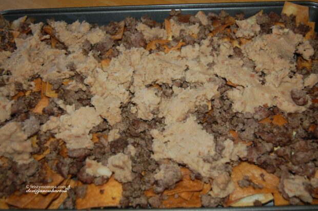 7. Put the refried beans in a bowl. Warm up for 2 minutes or so to give it a spreadable consistency. Spread evenly on top of the ground beef mixture.