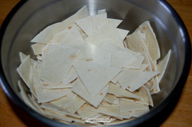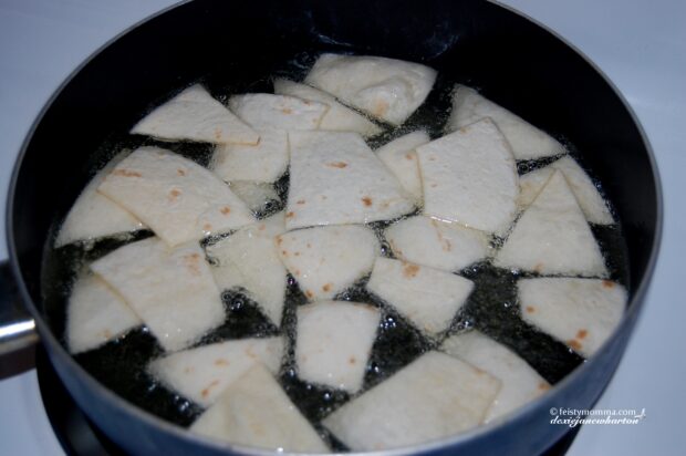 1. Cut the flour tortillas into small triangles. (OPTIONAL: Use a couple of bags of Dorito's Nachos and skip this and the frying steps)