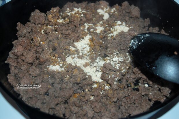 4. In a skillet, brown the ground beef. Discard the grease. Season with Taco seasonings. PS: I ran out so I used Fajitas seasoning(ultimately the same 😊)